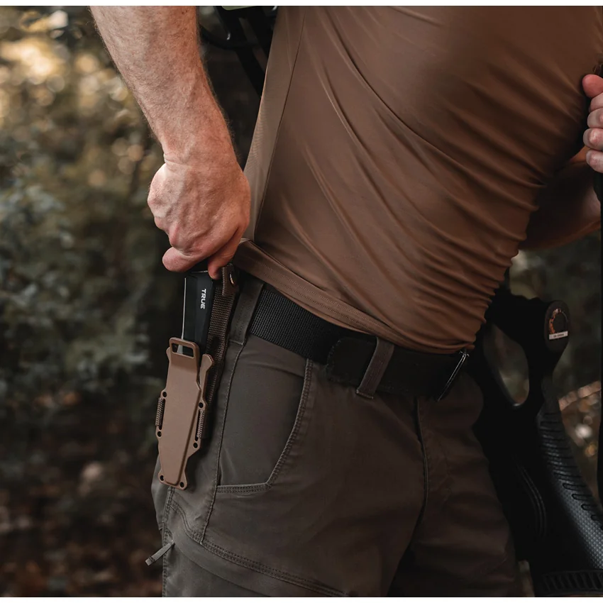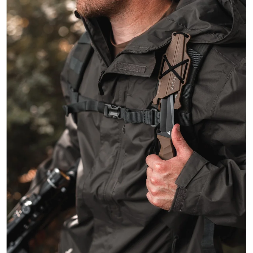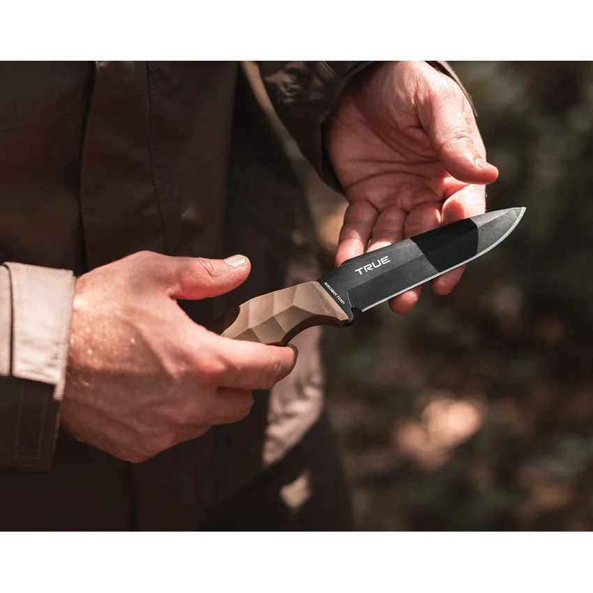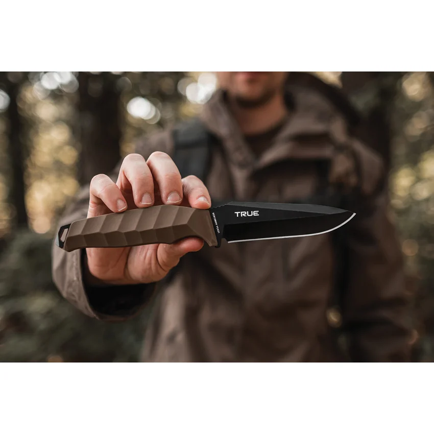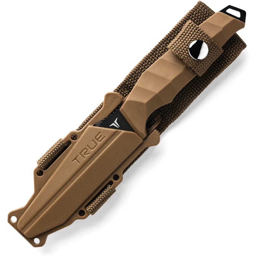8″ (20.32cm) overall. 4″ (10.16cm) black oxide coated 8Cr13MoV stainless drop point blade. Tan TPR handle. Glass breaker. Lanyard hole. Tan molded plastic MOLLE compatible belt sheath. Boxed.