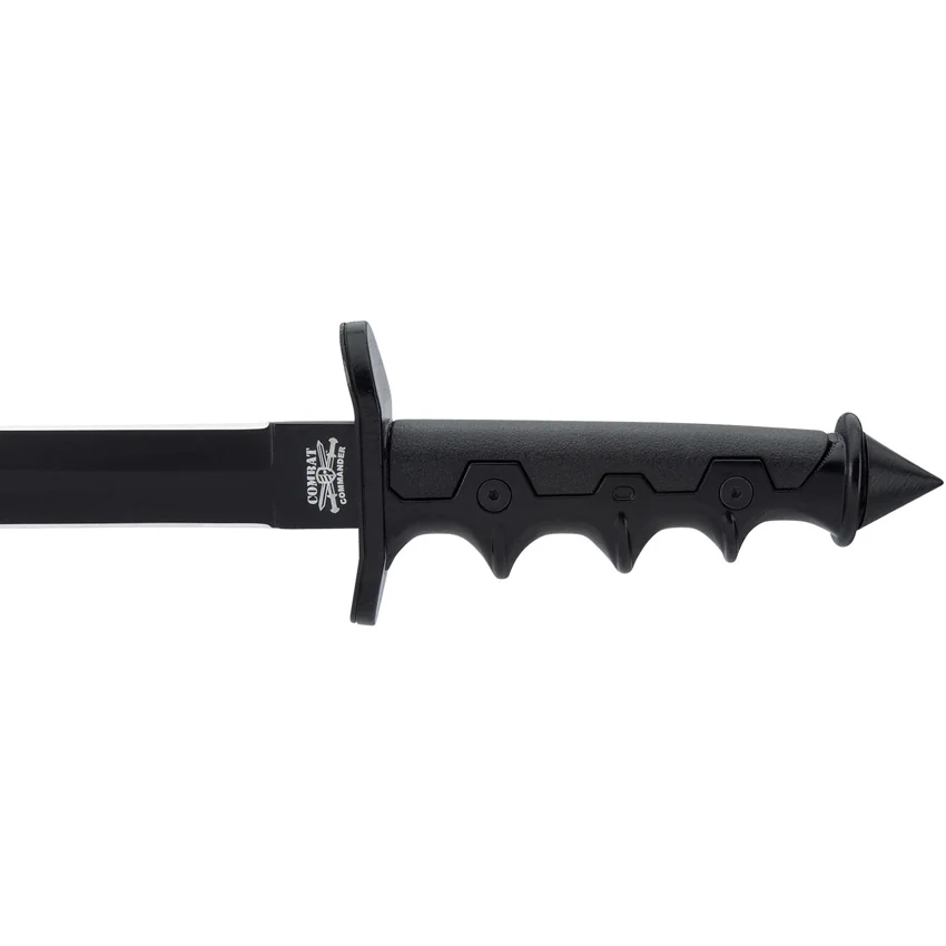 13.38″ (33.99cm) overall. 8.13″ (20.65cm) black coated double edge 1065 carbon steel blade. Black powder coated aluminum handle with black TPR insert. Finger grooved handle with skull crusher pommel. Black leather belt sheath. Boxed.