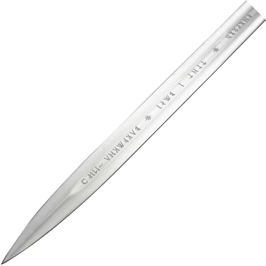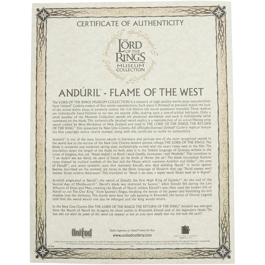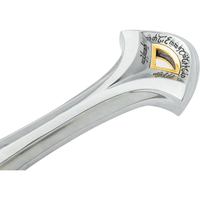 52.78″ (134.06cm) overall. 40.63″ (103.2cm) 1060HC steel blade. Brown leather wrapped handle. Museum Collection. Antique finish metal crossguard and pommel and 24K gold plated fittings. Serialized. Certificate of Authenticity. Includes 14.13″ wooden wall display with detailed gold-plated metal crest and sword mounting arms. Also includes Gondorian themed blue cloth banner that can be hung behind display. Boxed.