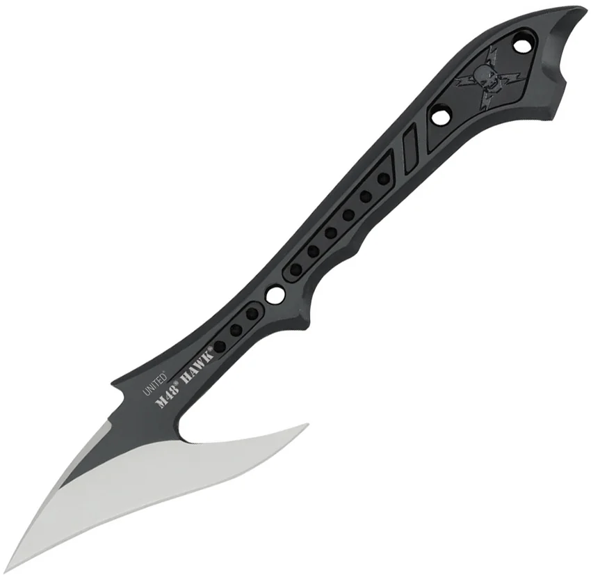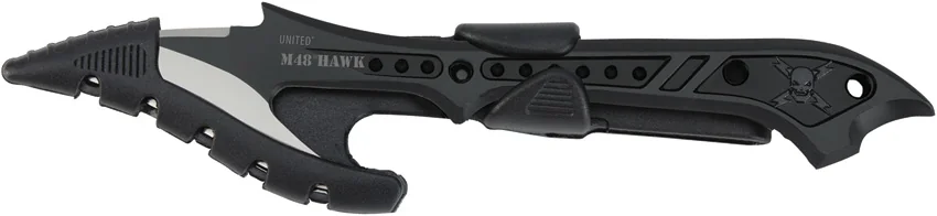 8 1/4″ overall. 3 3/4″ curved blade with sharpened tip. One-piece AUS-6 stainless construction with black oxide coating. Lashing holes allow attachment to a wooden rod or stick, making an excellent harpoon or spear that can be used for hunting, fishing, and much more. Black rubberized belt sheath.
