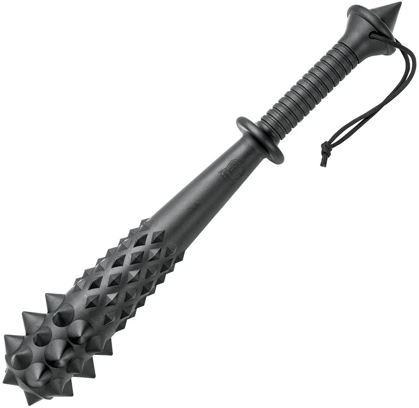 20″ overall. Glass breaker. Features large and small spikes. Paracord wrist lanyard. Polypropylene construction. Color: Black. Hang packaged.