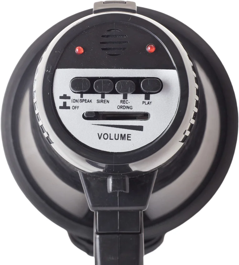 Measures 8 5/8″ overall. Black composition housing with folding handle. Features built-in microphone, push button on/off switch, siren, recording, play back, LED light indicator and adjustable volume. CE standard. Black nylon wrist strap. Uses four C batteries (not included).