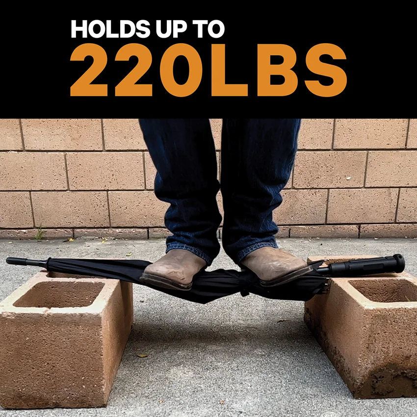 Reinforced fiberglass shaft. Tensile strength up to 220lbs. 100% waterproof polyester canopy with 44″ coverage diameter. Carbide glass breaker tip. Windproof engineered internal rib construction. Quick-release activation button. Sturdy locking mechanism. Boxed.