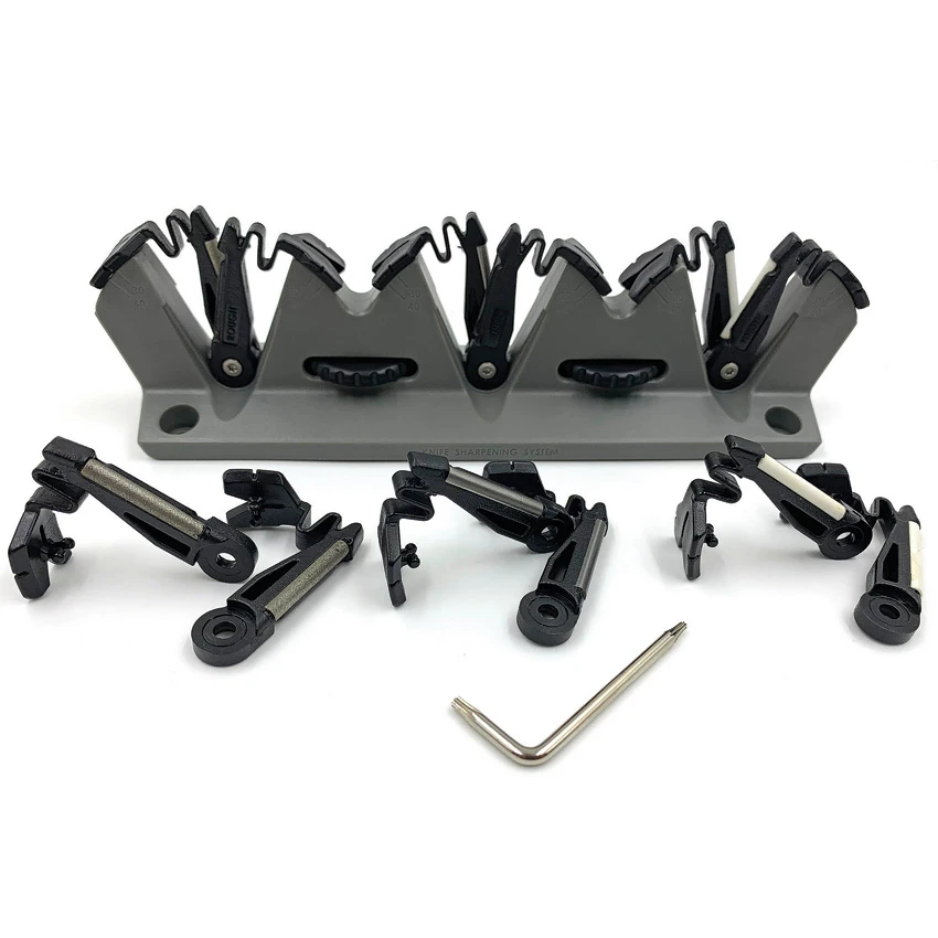 Molded flex system. Adjustable to 30 and 40 degree angles. Bench-top mounting holes. Suction cups for smooth surfaces. Full set of replacement parts (Diamond, Carbide, Ceramic). Clam packed.