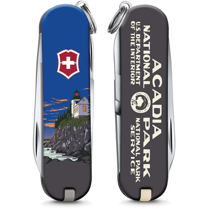 2.25″ closed. ABS handle. Tools include: Small blade l Scissors l File l Toothpick l Tweezers l Keyring l Screwdriver tip. Acadia National park handle artwork. Clam packed.