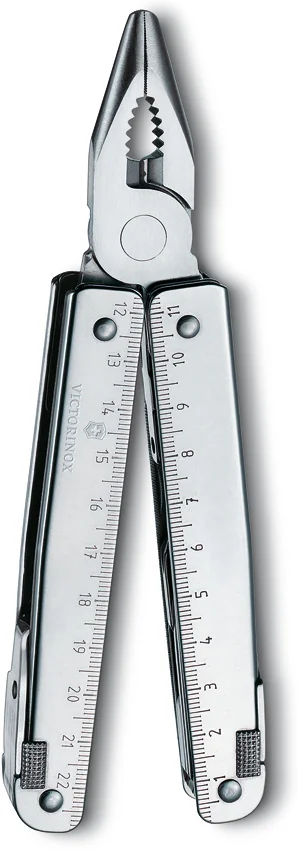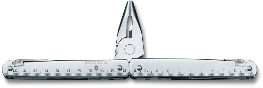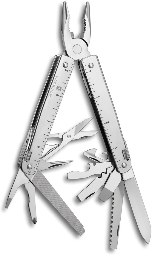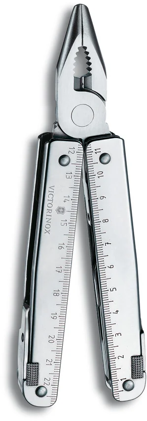 4.5″ closed. Stainless handles. Tools include: Pliers l Wire cutter l Wire crimper l Wire stripper l Large blade l Saw blade l Scissors l Reamer with sewing eye l Bottle opener l Can opener l Flat head screwdriver l Screwdriver tip l Small screwdriver l Phillips screwdriver l Pry bar l Lanyard loop l Metric ruler l Ruler. Additional tools include: Chisel with scraper I Wire scraper I Coupling for corkscrew I Metal saw I Metal file. Black nylon belt sheath. Boxed. Previously listed as item# VN30327U.