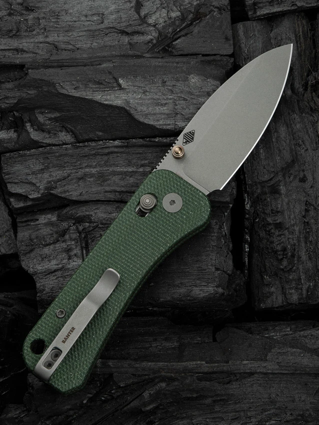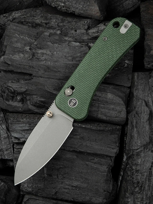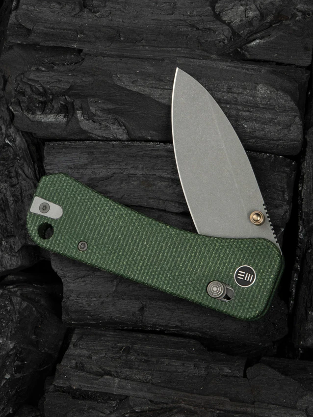 3.88″ (9.86cm) closed. 2.88″ (7.32cm) stonewash finish CPM S35VN stainless drop point blade. Green canvas micarta handle. Thumb stud. Lanyard hole. Pocket clip. Black nylon zippered storage case. Boxed.
