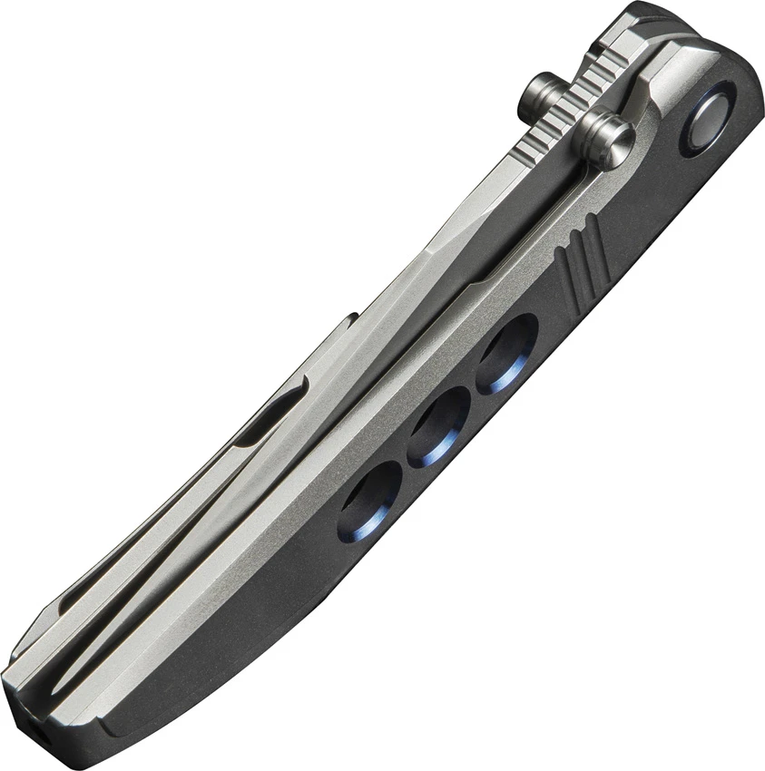 5″ (12.7cm) closed. 4″ (10.16cm) bead blast finish Bohler M390 stainless blade. Bead blast finish titanium handle. Extended tang. Thumb stud. Pocket clip. Integral handle. Black nylon zippered storage case. Boxed.