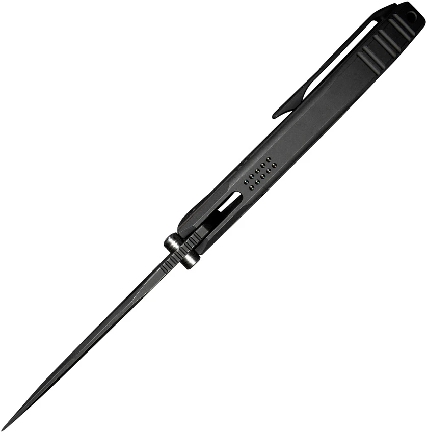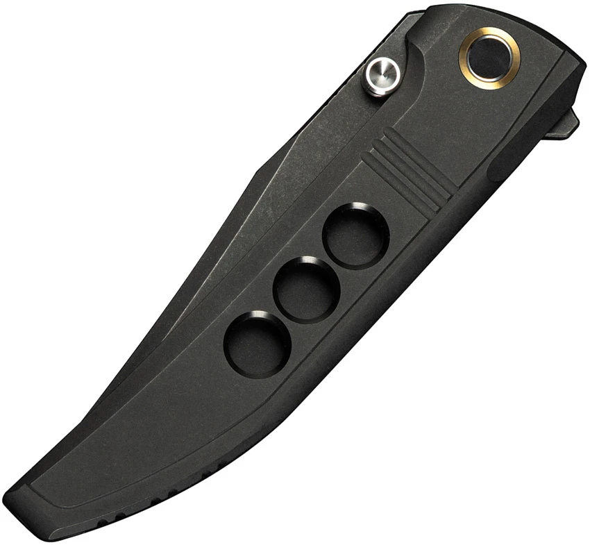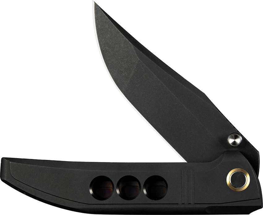 5″ (12.7cm) closed. 4″ (10.16cm) black stonewash finish Bohler M390 stainless blade. Black stonewash finish titanium handle. Extended tang. Thumb stud. Pocket clip. Integral handle. Black nylon zippered storage case. Boxed.