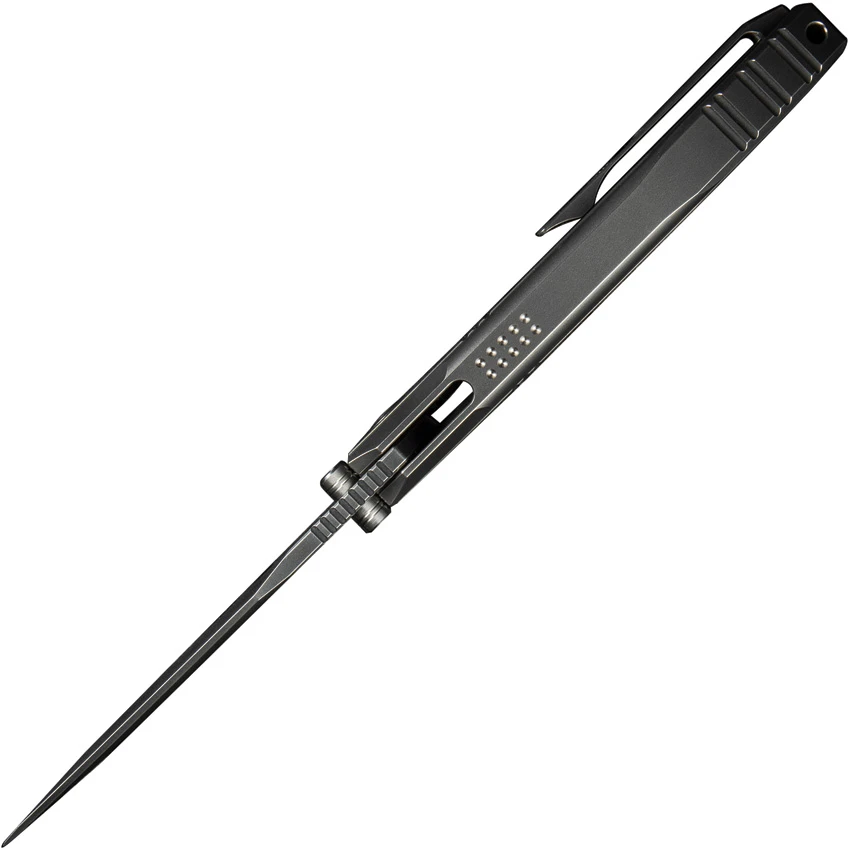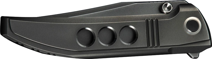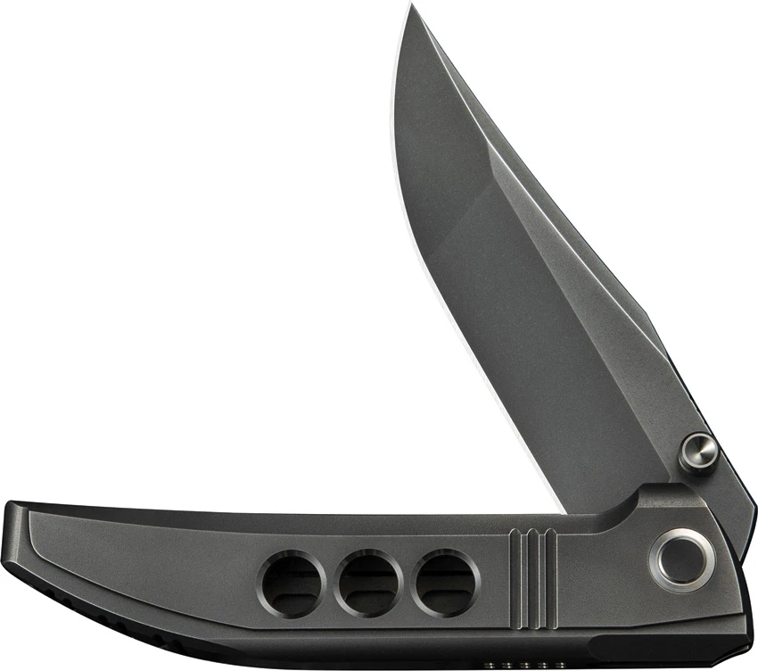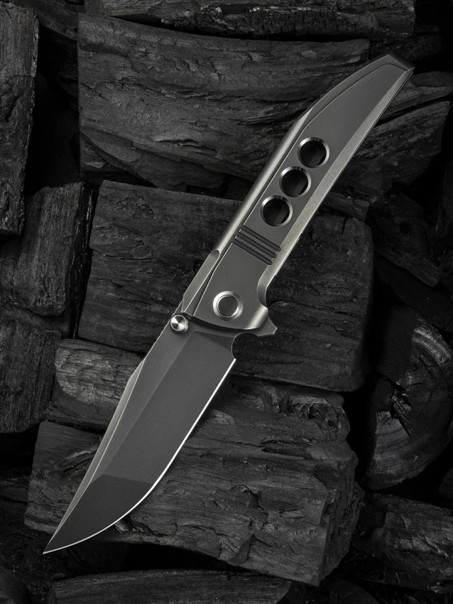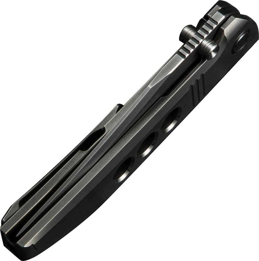 5″ (12.7cm) closed. 4″ (10.16cm) Bohler M390 stainless blade. Titanium handle. Extended tang. Thumb stud. Pocket clip. Integral handle. Polished gray blade and handle. Black nylon zippered storage case. Boxed.