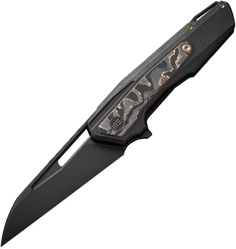 5.25″ (13.34cm) closed. 3.63″ (9.22cm) black stonewash finish CPM-20CV stainless Wharncliffe blade. Black stonewash finish titanium handle with Copper foil carbon fiber inlay. Thumb pull. Extended tang. Lanyard hole. Pocket clip. Black nylon zippered storage case. Boxed. No Amazon Sales