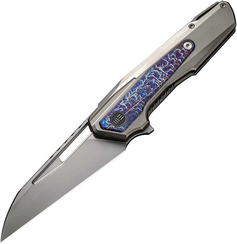 5.25″ (13.34cm) closed. 3.63″ (9.22cm) bead blast finish CPM-20CV stainless Wharncliffe blade. Gray titanium handle with Flame anodized titanium inlay. Extended tang. Lanyard hole. Pocket clip. Thumb pull. Black nylon zippered storage case. Boxed. No Amazon Sales