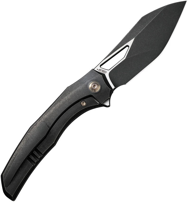 4.38″ (11.13cm) closed. 3.38″ (8.59cm) black stonewash finish CPM-20CV stainless blade. Black stonewash finish titanium handle. Extended tang. Thumb pull. Pocket clip. Wharnto (Wharncliffe/tanto) blade. Black nylon zippered storage case. Boxed.