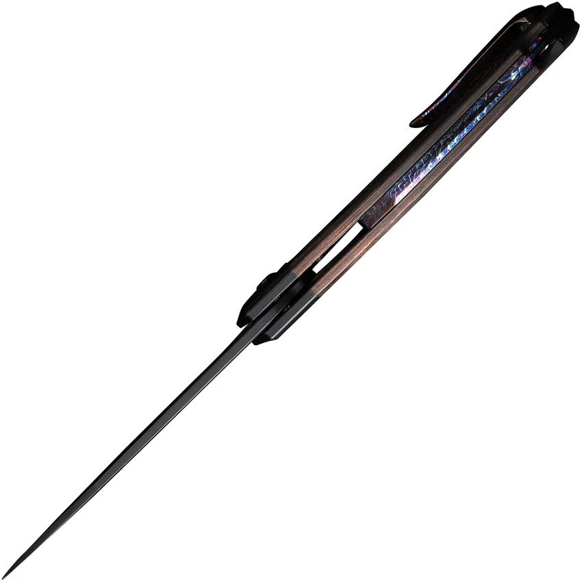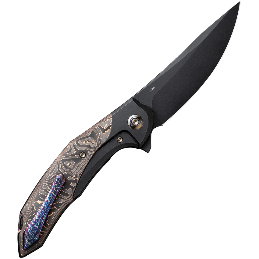 5″ (12.7cm) closed. 3.75″ (9.53cm) black stonewash finish CPM-20CV stainless trailing point blade. Black stonewash finish titanium handle with Copper foil carbon fiber inlay. Extended tang. Lanyard hole. Pocket clip. Limited edition of 205 pieces. Black nylon zippered storage case. Boxed.