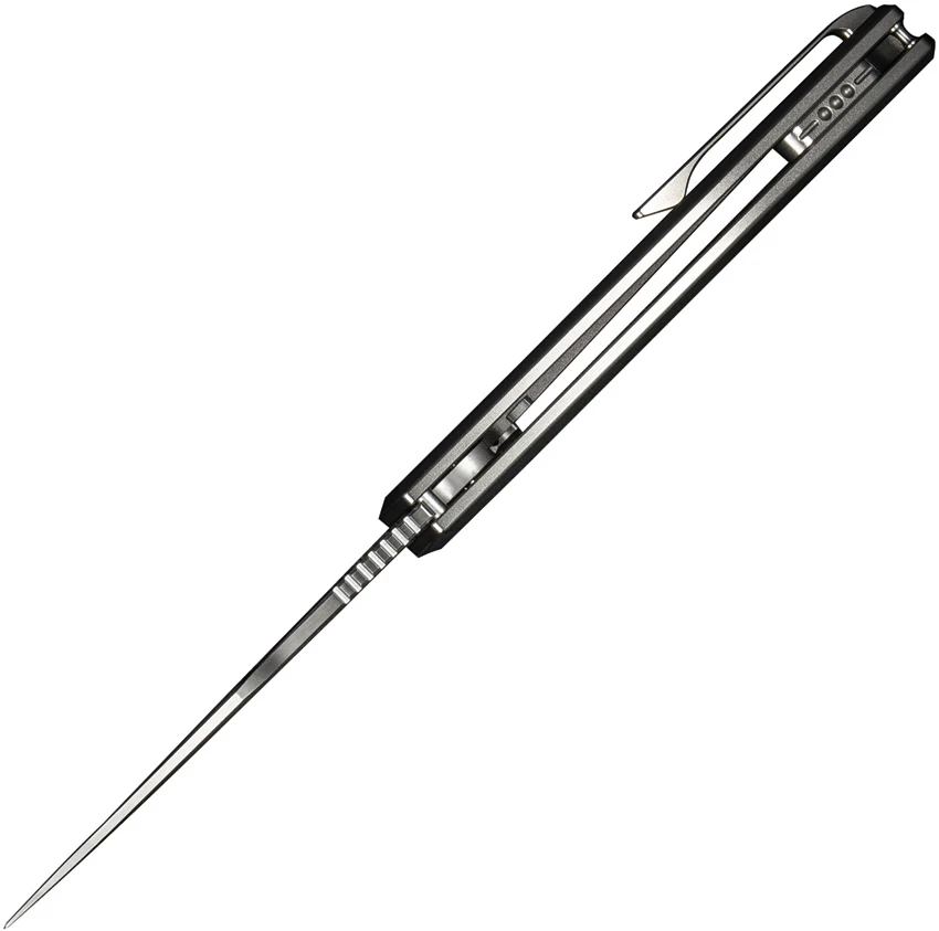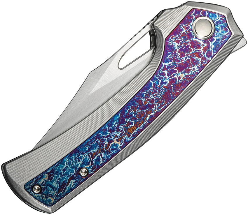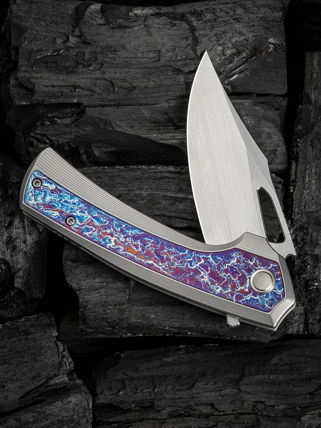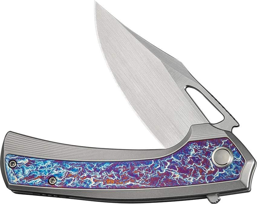 4.75″ (12.07cm) closed. 3.5″ (8.89cm) satin finish CPM-20CV stainless clip point blade. Bead blast finish titanium handle with Flame anodized titanium inlay. Pocket clip. Thumb pull. Limited edition of 260 pieces. Black nylon zippered storage case. Boxed.