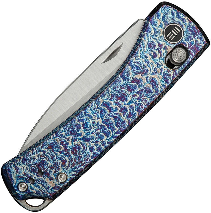 4″ (10.16cm) closed. 3″ (7.62cm) satin finish CPM-20CV stainless drop point blade. Flame anodized titanium handle. Pocket clip. Lanyard hole. Black nylon zippered storage case. Boxed.