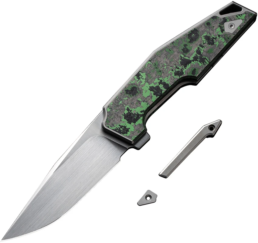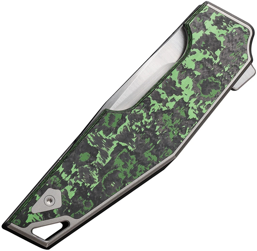 4.5″ (11.43cm) closed. 3.5″ (8.89cm) stonewash and satin finish CPM-20CV stainless blade. Bead blast finish titanium handle with Jungle Wear Fat carbon fiber inlay. Extended tang. Lanyard hole. Pocket clip. Includes extra left carry titanium pocket clip and insert. Black nylon zippered storage case. Boxed. No 3rd Party Sales (must be sold from your store or your web site, not a third party site such as Amazon, eBay, etc)