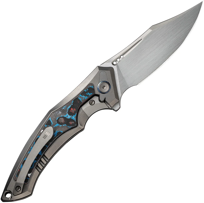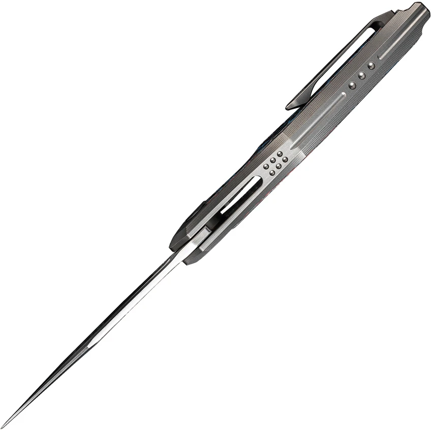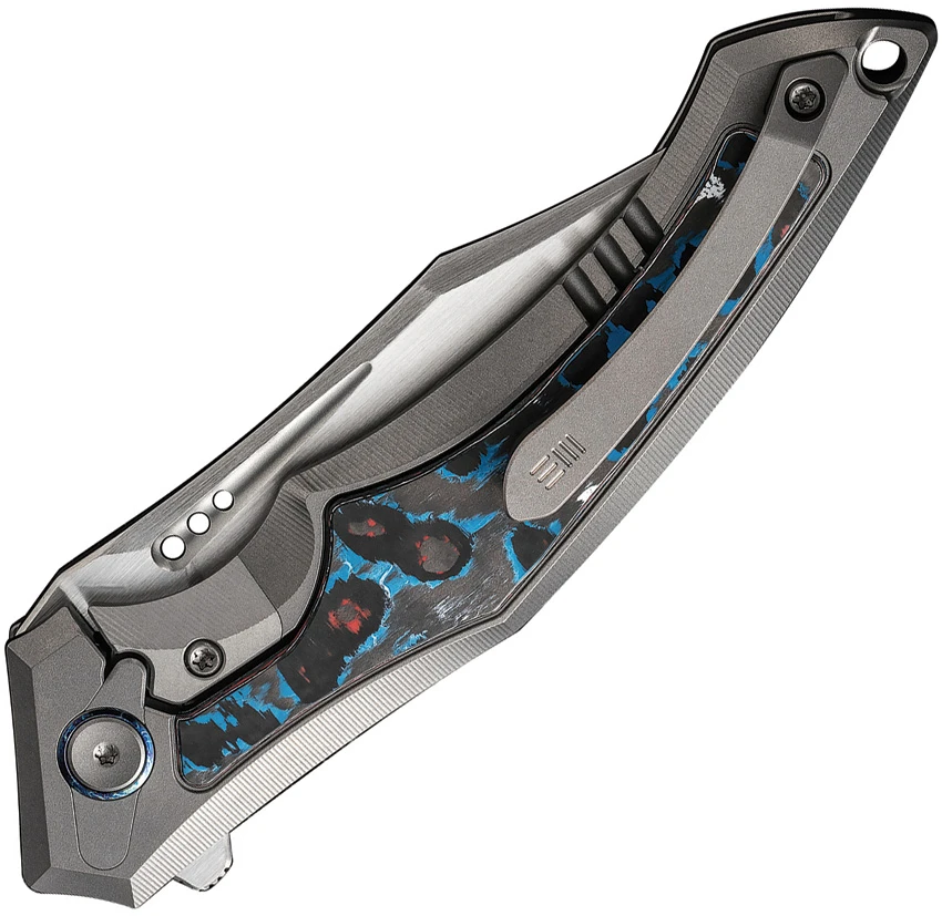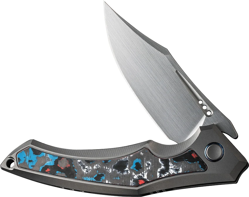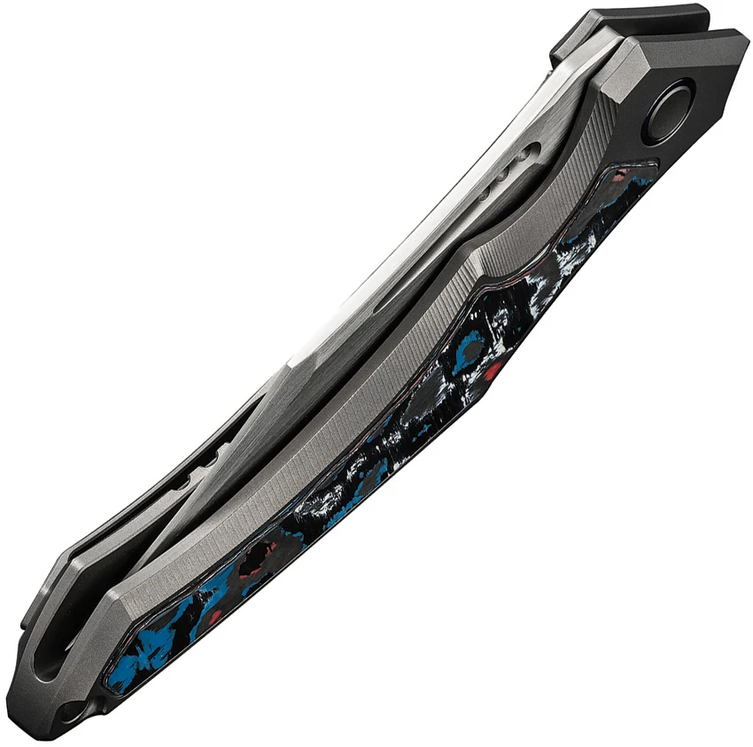 5″ (12.7cm) closed. 3.5″ (8.89cm) satin finish CPM-20CV stainless clip point blade. Gray titanium handle with Nebula Fat carbon fiber inlay. Extended tang. Lanyard hole. Pocket clip. Black nylon zippered storage case. Boxed.