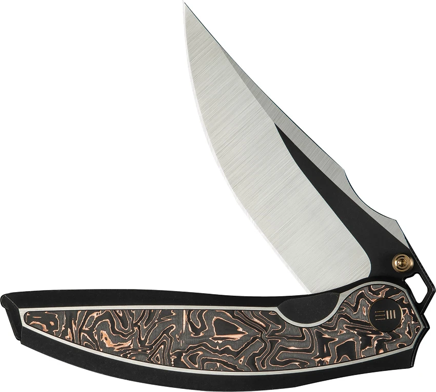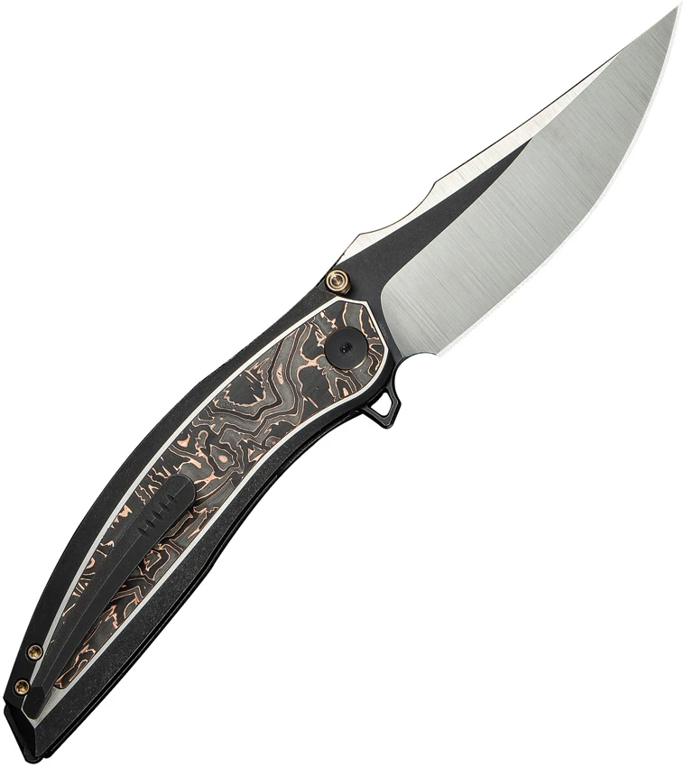 5″ (12.7cm) closed. 4″ (10.16cm) black stonewash and satin finish Bohler M390 stainless clip point blade. Black stonewash finish titanium handle with Copper foil carbon fiber inlay. Extended tang. Pocket clip. Thumb stud. Black nylon zippered storage case. Boxed.
