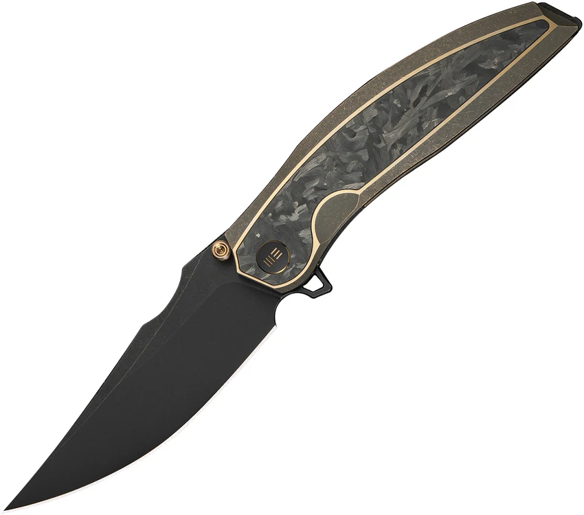 5″ (12.7cm) closed. 4″ (10.16cm) black stonewash finish Bohler M390 stainless clip point blade. Bronze stonewash finish titanium handle with Shredded carbon fiber inlay. Extended tang. Pocket clip. Thumb stud. Black nylon zippered storage case. Boxed.