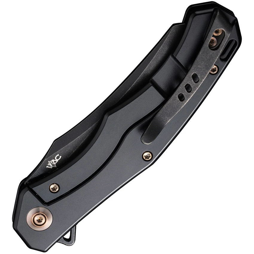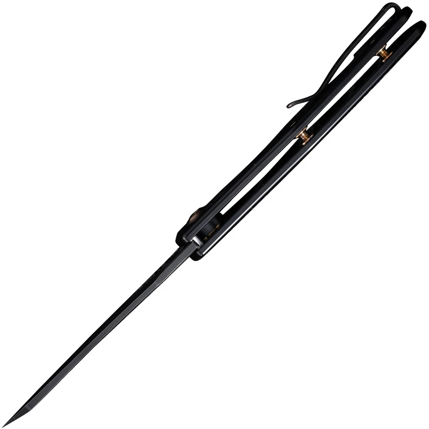 4.63″ (11.76cm) closed. 3.63″ (9.22cm) black stonewash finish CPM-20CV stainless blade. Black and gold titanium handle. Extended tang. Lanyard hole. Pocket clip. Reverse tanto blade. Black nylon pouch. Boxed.