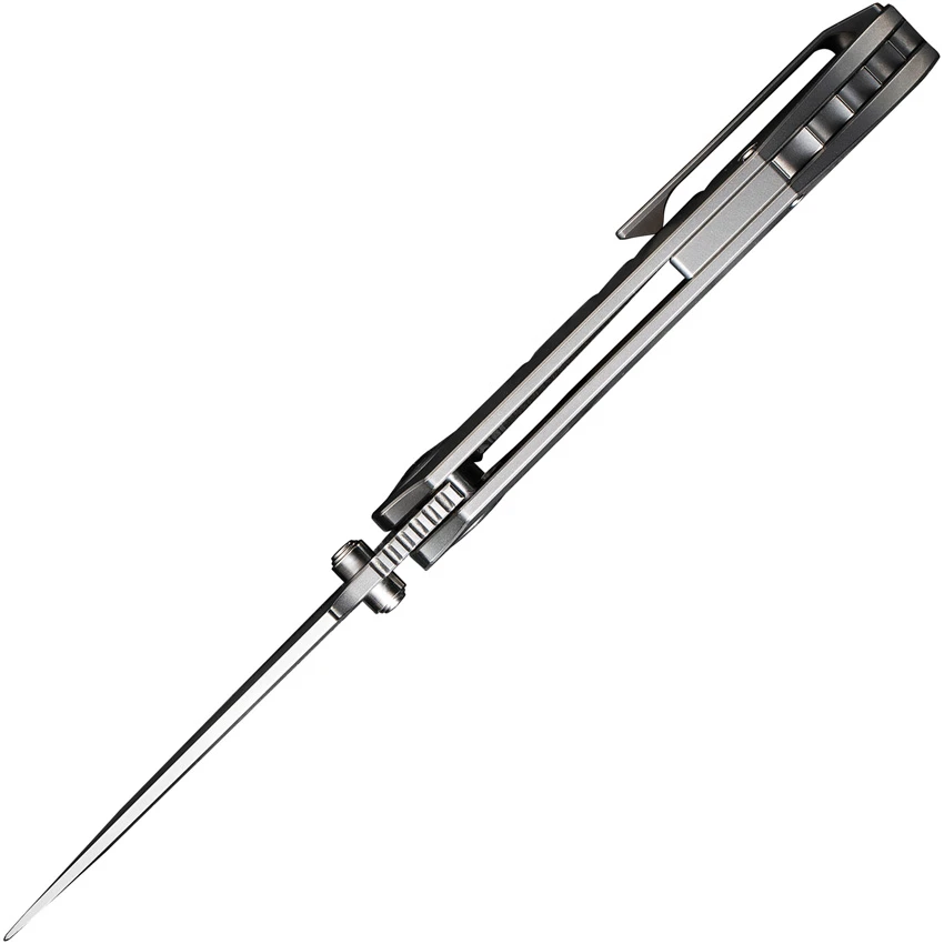 4.13″ (10.49cm) closed. 3.13″ (7.95cm) bead blast finish CPM-20CV stainless blade. Bead blast finish titanium handle. Thumb stud. Pocket clip. Black nylon zippered storage case. Boxed.