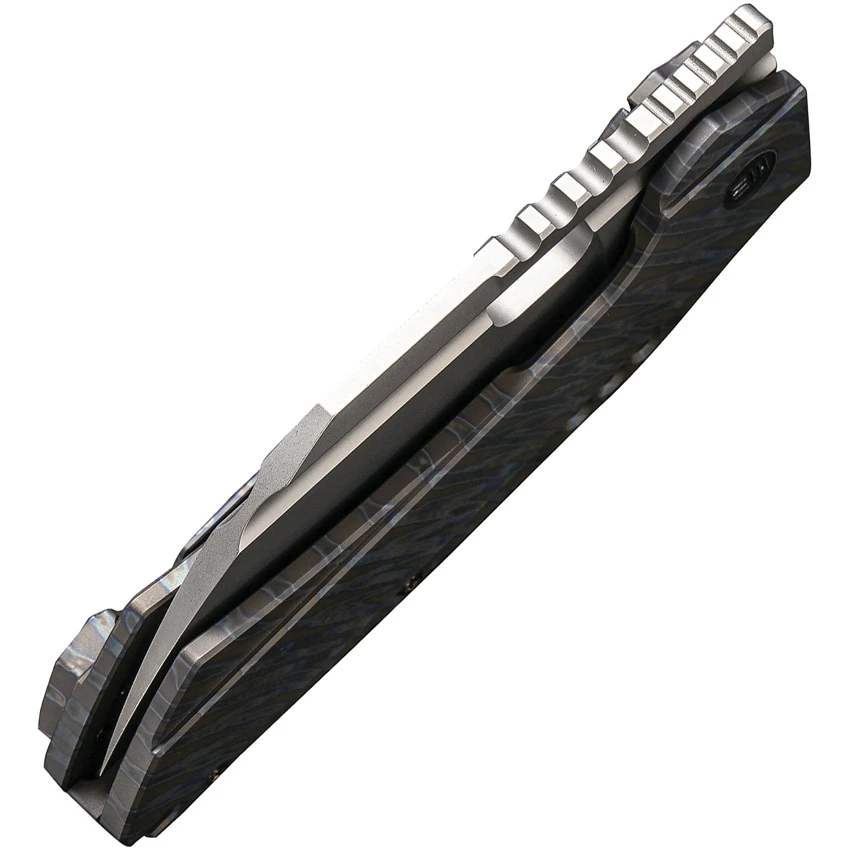 4.13″ (10.49cm) closed. 3.13″ (7.95cm) stonewash finish CPM S35VN stainless blade. Tiger striped anodized titanium handle. Extended tang. Lanyard hole. Pocket clip. Thumb pull. Boxed.