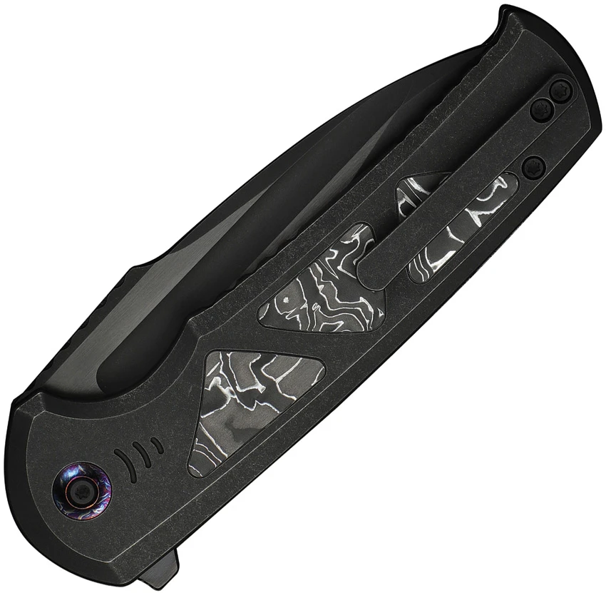 5″ (12.7cm) closed. 3.88″ (9.86cm) black stonewash finish Bohler M390 stainless drop point blade. Black titanium handle with Aluminum foil carbon fiber inlay. Extended tang. Pocket clip. Black nylon zippered storage case. Boxed.
