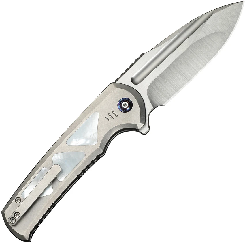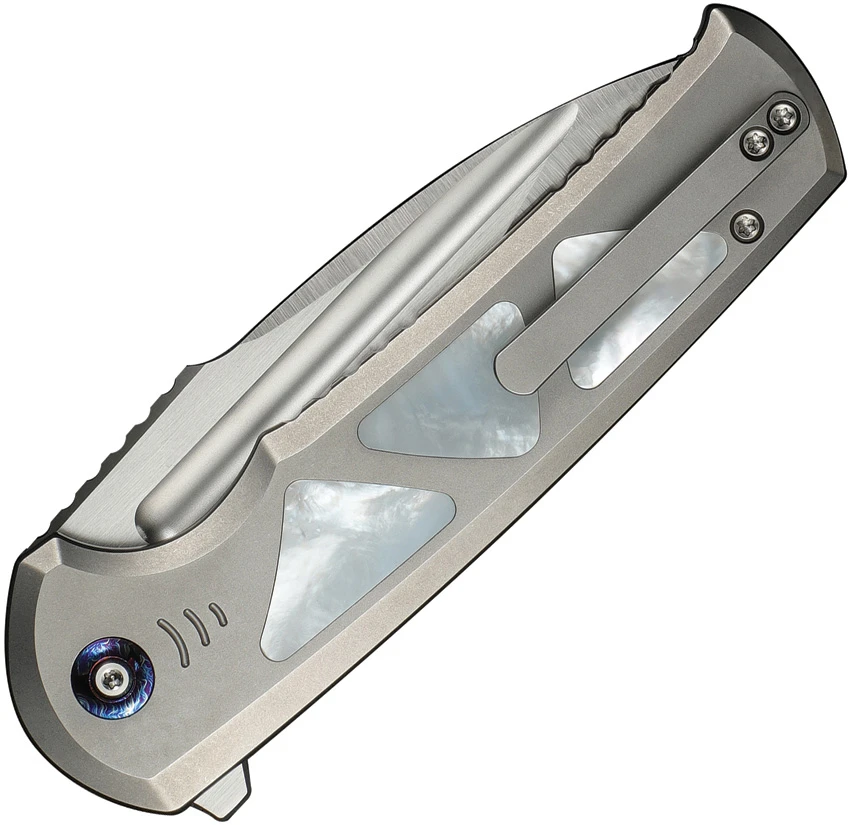 5″ (12.7cm) closed. 3.88″ (9.86cm) satin finish Bohler M390 stainless drop point blade. Gray titanium handle with mother of pearl inlay. Extended tang. Pocket clip. Black nylon zippered storage case. Boxed.
