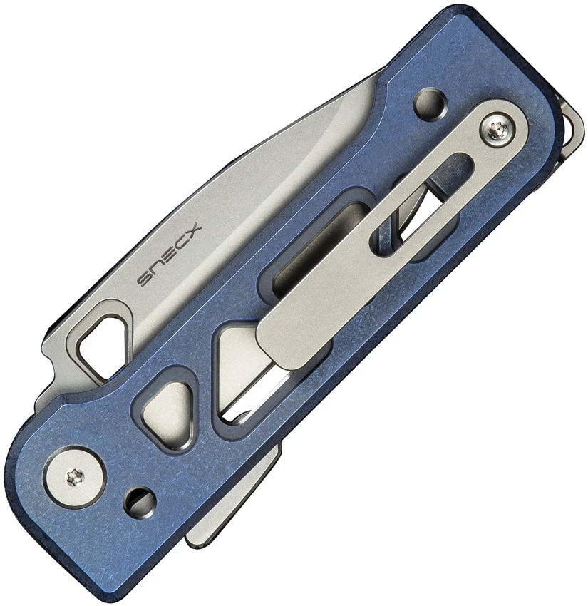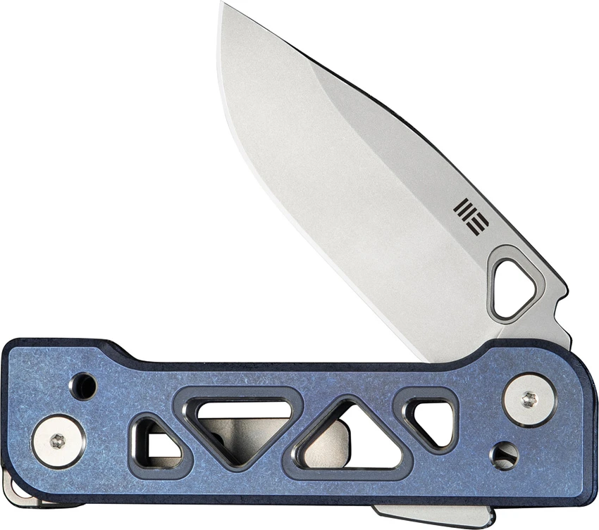 3.88″ (9.86cm) closed. 2.88″ (7.32cm) stonewash finish CPM-20CV stainless drop point blade. Blue titanium handle. Thumb pull. Lanyard hole. Pocket clip. Black nylon zippered storage case. Boxed.