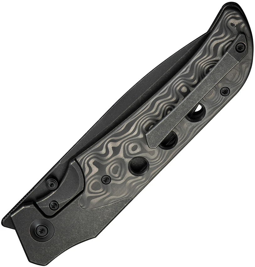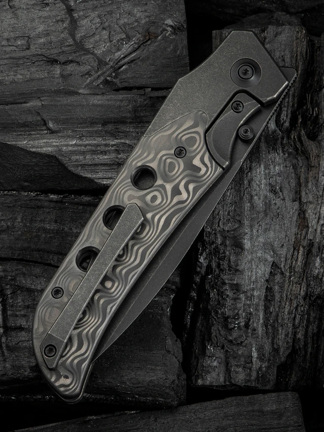 5.25″ (13.34cm) closed. 4″ (10.16cm) black stonewash finish CPM-20CV stainless blade. Black stonewash finish titanium handle with Rose carbon fiber inlay. Thumb stud. Pocket clip. Extended tang. Black nylon zippered storage case. Boxed.