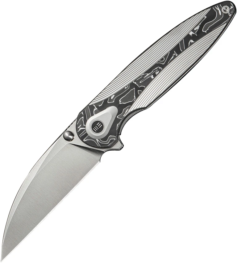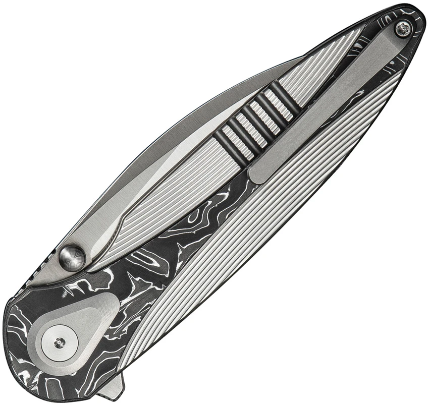 4.63″ (11.76cm) closed. 3.38″ (8.59cm) satin finish Bohler M390 stainless Wharncliffe blade. Gray titanium handle with Aluminum foil carbon fiber inlay. Extended tang. Thumb stud. Pocket clip. Black nylon zippered storage case. Boxed.
