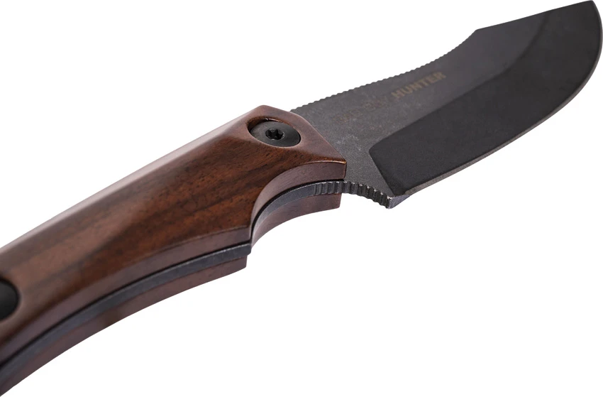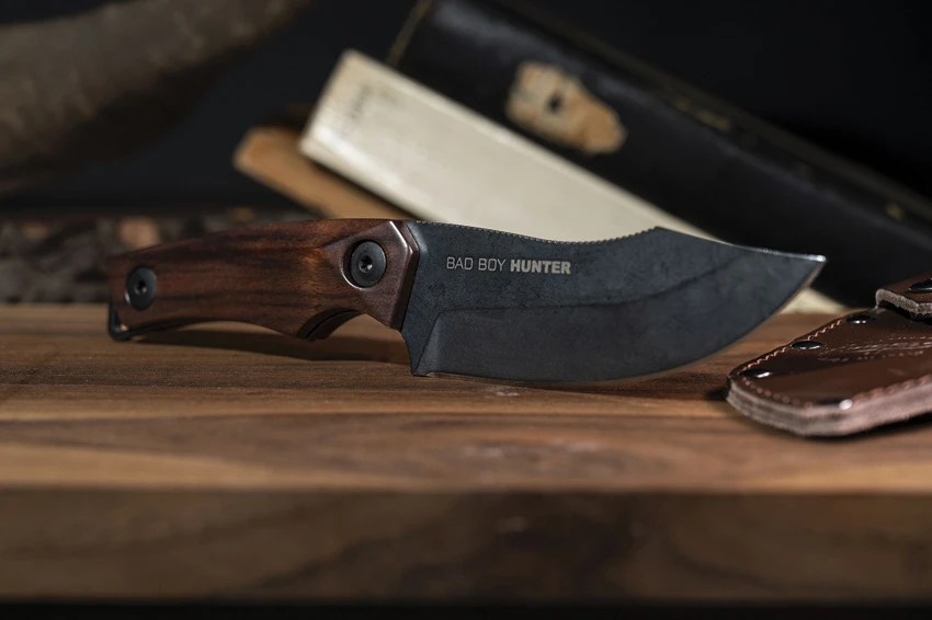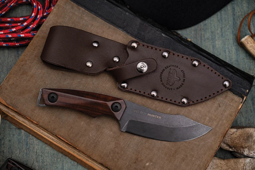7.5″ (19.05cm) overall. 3.75″ (9.53cm) acid washed finish D2 tool steel blade. Walnut handle. Full, extended tang. Lanyard hole. Brown leather belt sheath. Boxed.