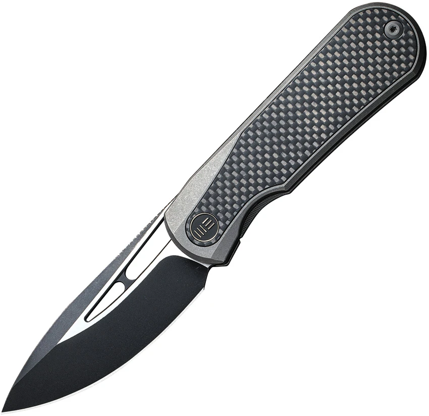 4.5″ (11.43cm) closed. 3.25″ (8.26cm) two-tone finish CPM-20CV stainless drop point blade. Gray titanium handle with Twill carbon fiber inlay. Thumb pull. Pocket clip. Comes with one free mystery WE or CIVIVI model. Boxed.
