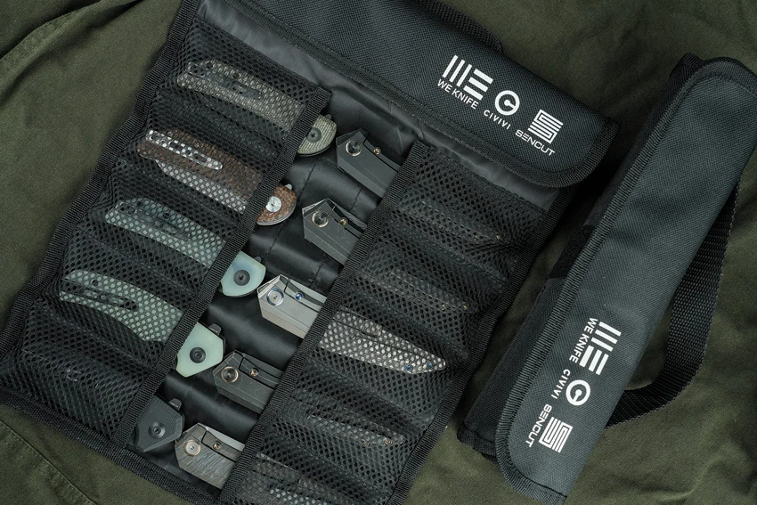 Hook & loop closure. Holds 10 folding knives. Nylon construction. Color: Black. Bulk packed. Free with any WE, Civivi, or Sencut purchase. Limit one per customer. Customer must request free item.