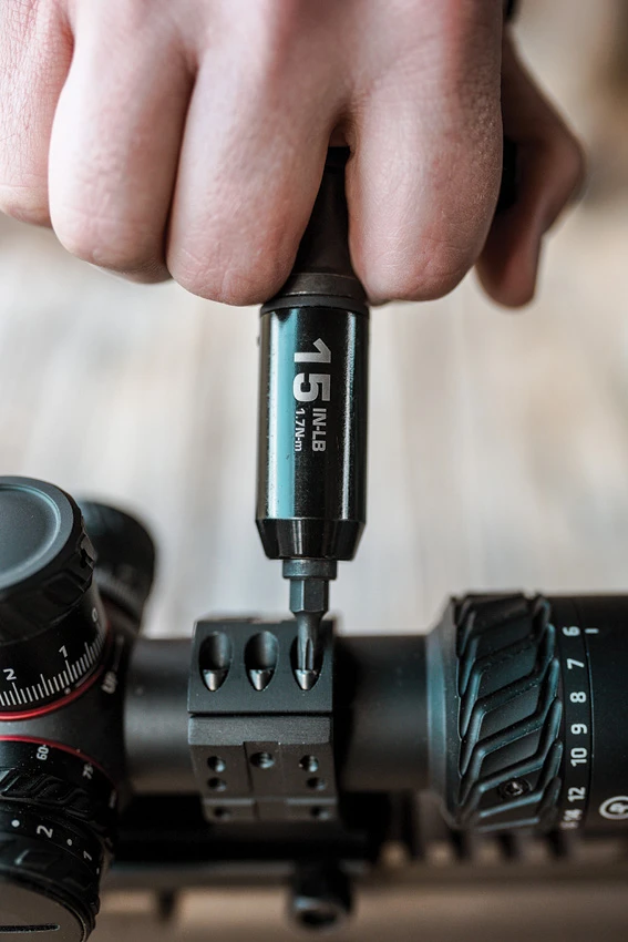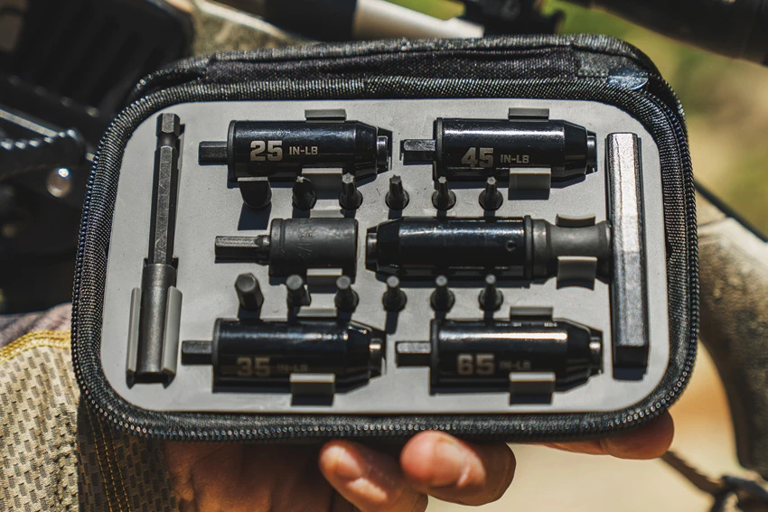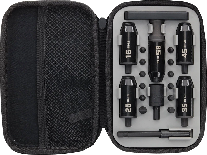 Includes: (12) Standard bits; (5) Limiters (15, 25, 35, 45, and 65 lbs); T-handle driver; 1/2″ socket with 1/4″ bit; 1/4″ bit extension; EVA storage case. Boxed.