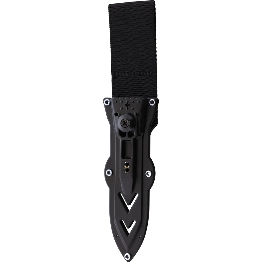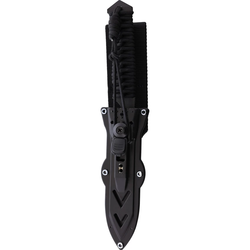 10″ (25.4cm) overall. 4.75″ (12.07cm) black powder coated Bohler N690 stainless tanto blade. Black paracord wrapped handle. Full, extended tang. Lanyard hole. Glass breaker. Black thermoplastic belt sheath. Boxed.