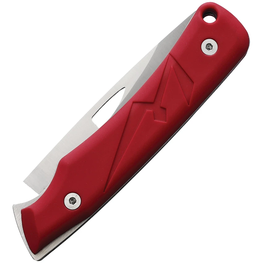 4.25″ (10.8cm) closed. 3.25″ (8.26cm) satin finish 14C28N Sandvik stainless blade. Red rubber handle. Thumb pull. Lanyard hole. Black leather pouch. Bulk packed.