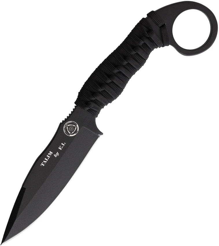 8.13″ (20.65cm) overall. 3.88″ (9.86cm) black powder coated 14C28N Sandvik stainless blade. Black paracord wrapped handle. Full, extended tang. Finger ring. Black Kydex belt sheath. Boxed.