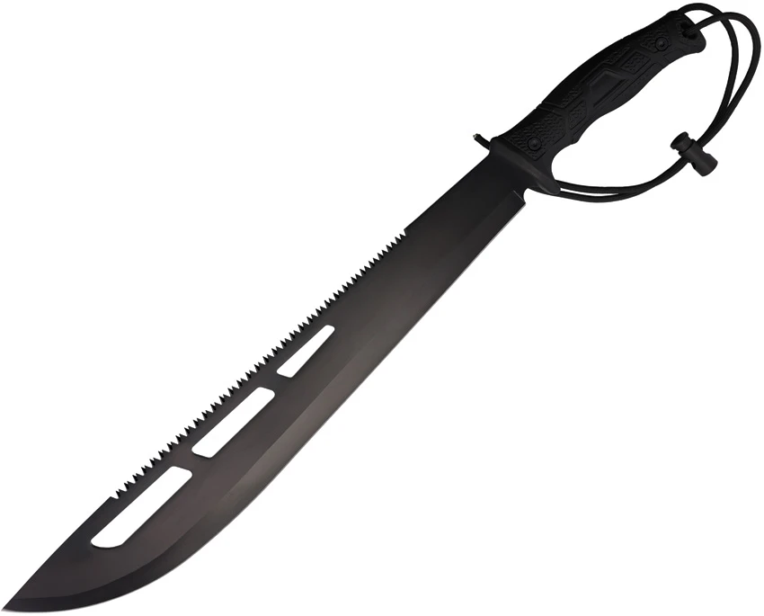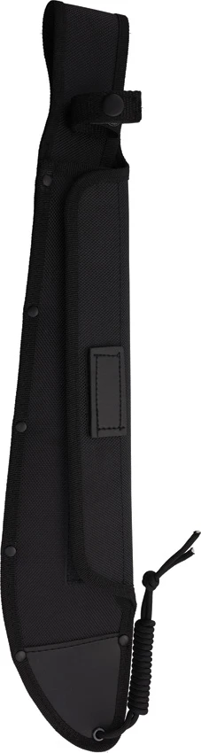 21″ (53.34cm) overall. 16″ (40.64cm) black finish sawback stainless blade. Black sculpted synthetic handle. Lanyard hole. Sheath with shoulder strap. Black nylon belt sheath. Boxed.