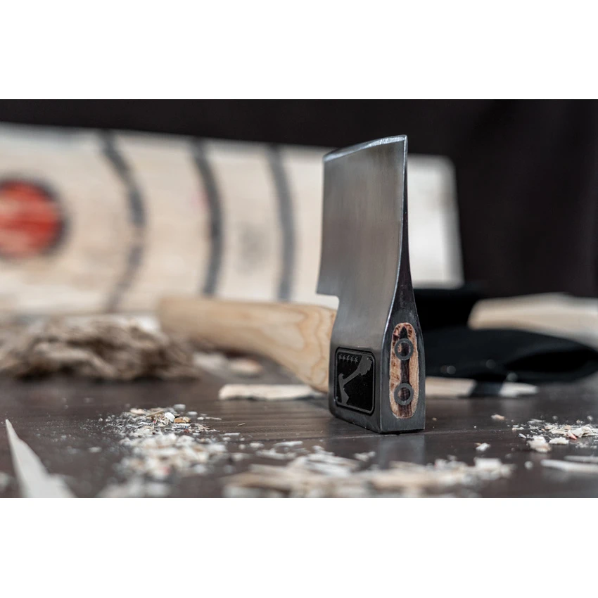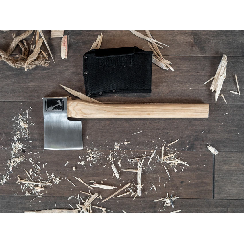 17″ overall. 5.75″ brushed finish 1045 carbon steel axe head with 4″ cutting edge. American Hickory handle. Weight: 2.25lb. 1.75 lb head. Black nylon belt sheath. Bulk packed.