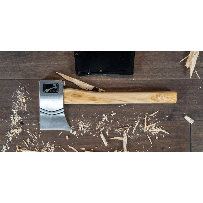 17″ overall. 5.75″ brushed finish 1045 carbon steel axe head with 4″ cutting edge. American Hickory handle. Weight: 2.45lb. 1.80 lb head. Black nylon belt sheath. Bulk packed.