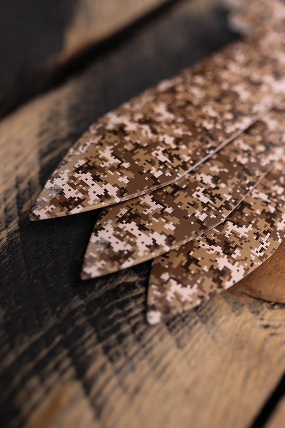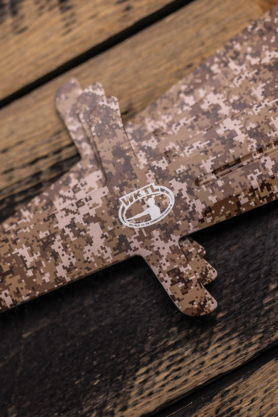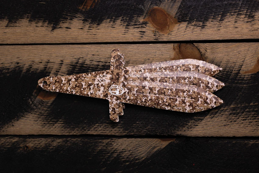 14.63″ (37.16cm) overall. 4″ (10.16cm) 3Cr13 stainless blade. Lanyard hole. Weight: 1.33lb. Cyber camo finish. Extended dual blade allows for full coverage over a full inch down the blade. Blade guards are formulated to protect our throwers from bounces and knives flying through protective fencing while still allowing for the highest precision. Boxed.