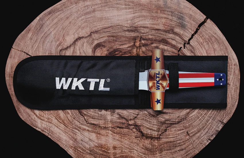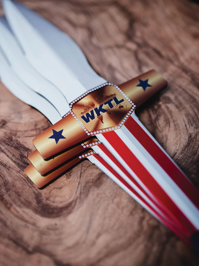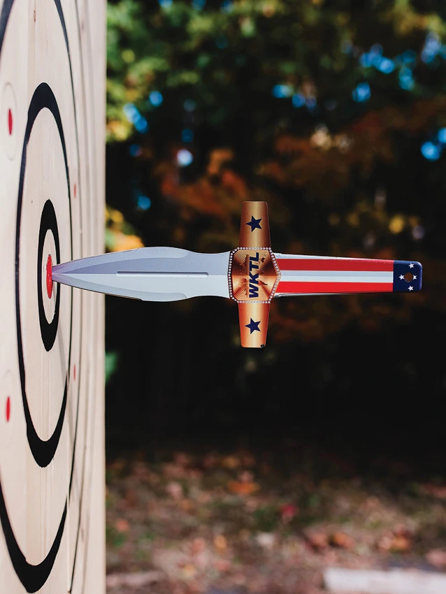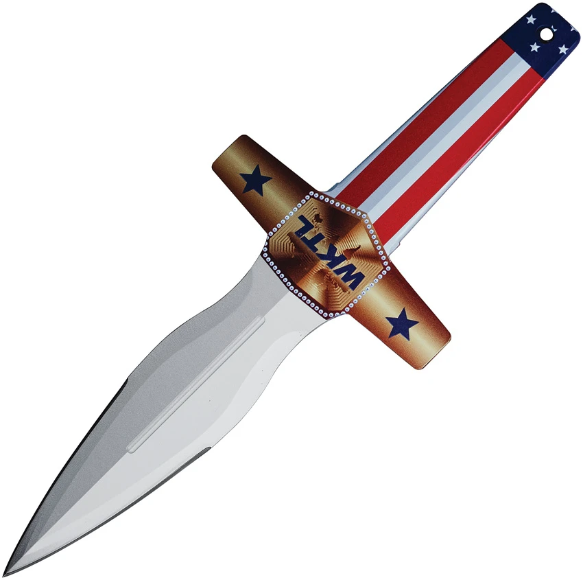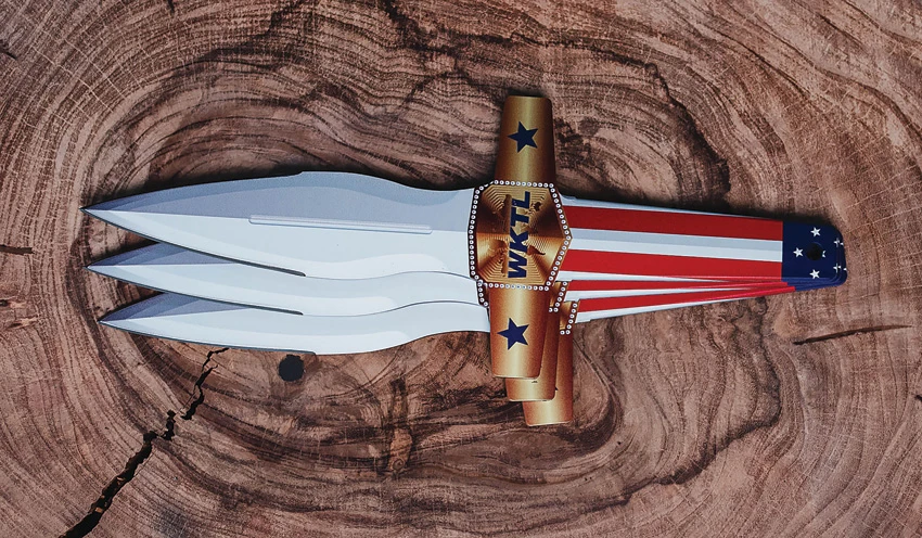 13.75″ (34.93cm) overall. 8.63″ (21.92cm) 3Cr13 stainless blade. Weight: 1.12lb. Set of three. Patriotic artwork. An extended dual bladed knife allows for full coverage over a full inch down the blade. WKTL blade guards are formulated to protect these throwers from bounces and knives flying through protective fencing while still allowing for the highest precision. Boxed.