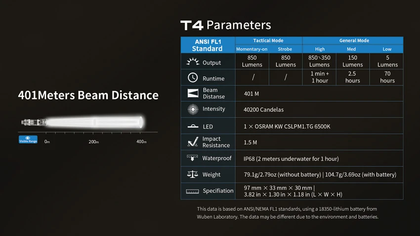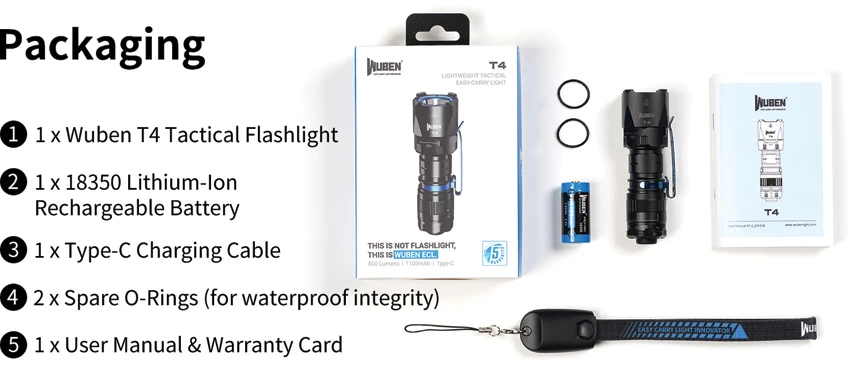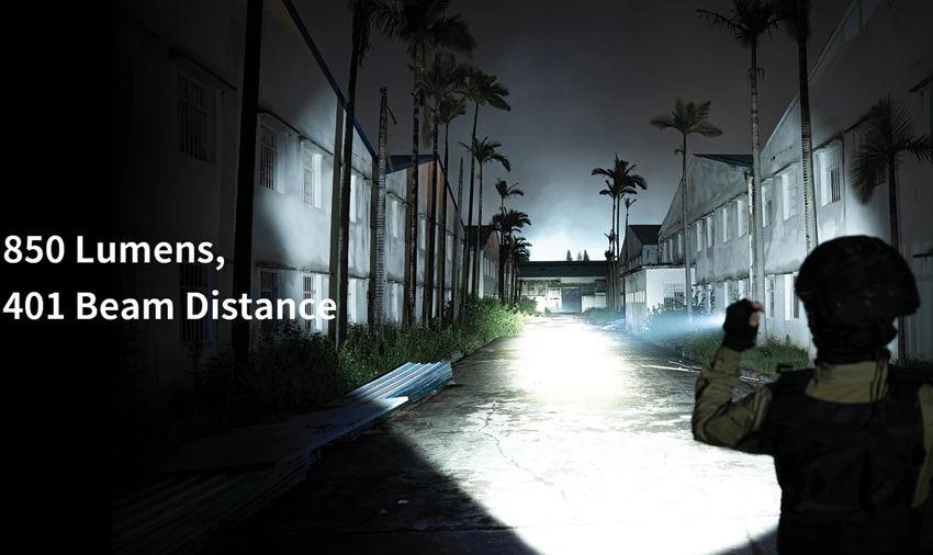3.82″ overall. Clip. Strobe. Water resistant. Impact resistant. Rechargeable. Modes: Tactical-Momentary On (850 lumens); High (850-350 lumens, 1m+1h runtime); Medium (150 lumens, 2.5h runtime); Low (5 lumens, 70h runtime). 401m beam distance. Hidden USB-C charging port. Requires (1) Lithium battery . Aluminum construction. Color: Black. Boxed with hanging tab.