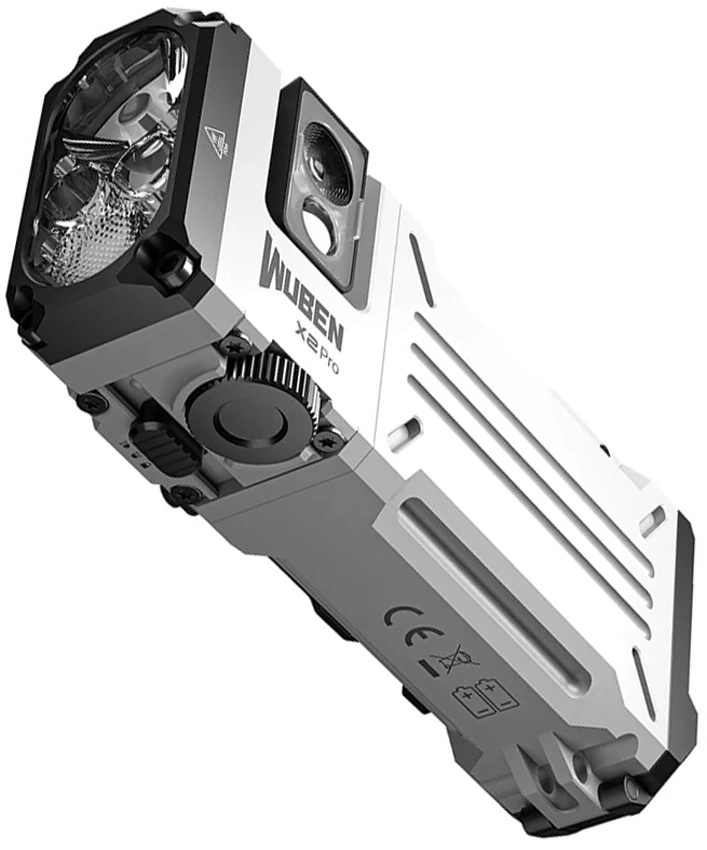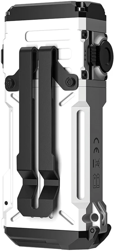 Dimensions: 1.63″ x 1″ x 3.58″. Water resistant. Impact resistant. Clip. Rechargeable. 1500 max lumens. 90 hour max runtime. 205m beam distance. Magnetic tail. Multifunctional side light-Integrated 400 lumen white module and 7 types of RGB lights/UV lights and 20 degree tiltable angle. Soft light diffuser. Bicycle mount. ARC helmet clip. Tactical switch. Main light modes: Turbo (1500-500 lumens, 1m-1.5h runtime); High (400 lumens, 2h runtime); Medium (150 lumens, 6h runtime); Low (15 lumens, 90h runtime). UV Side Light modes: White (400-5 lumens, 4-130h runtime); UV light (365mw/1w, 6h runtime). Requires (2) 14500 batteries (included). Aluminum construction. Color: White. Boxed with hanging tab.