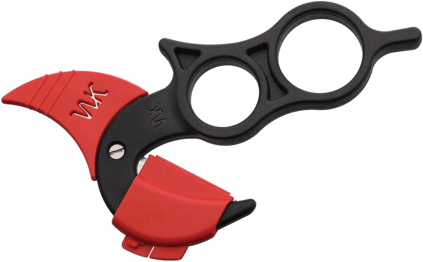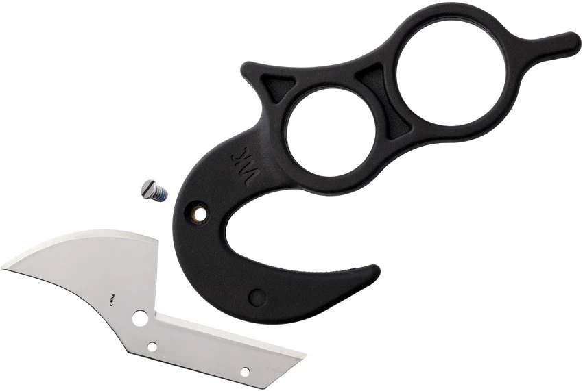 4.25″ (10.8cm) overall. Stainless blade. Black synthetic handle. Finger ring. One-piece replaceable blade with two edges. Comes with plastic blade guards. Black nylon belt sheath. Clam packed.